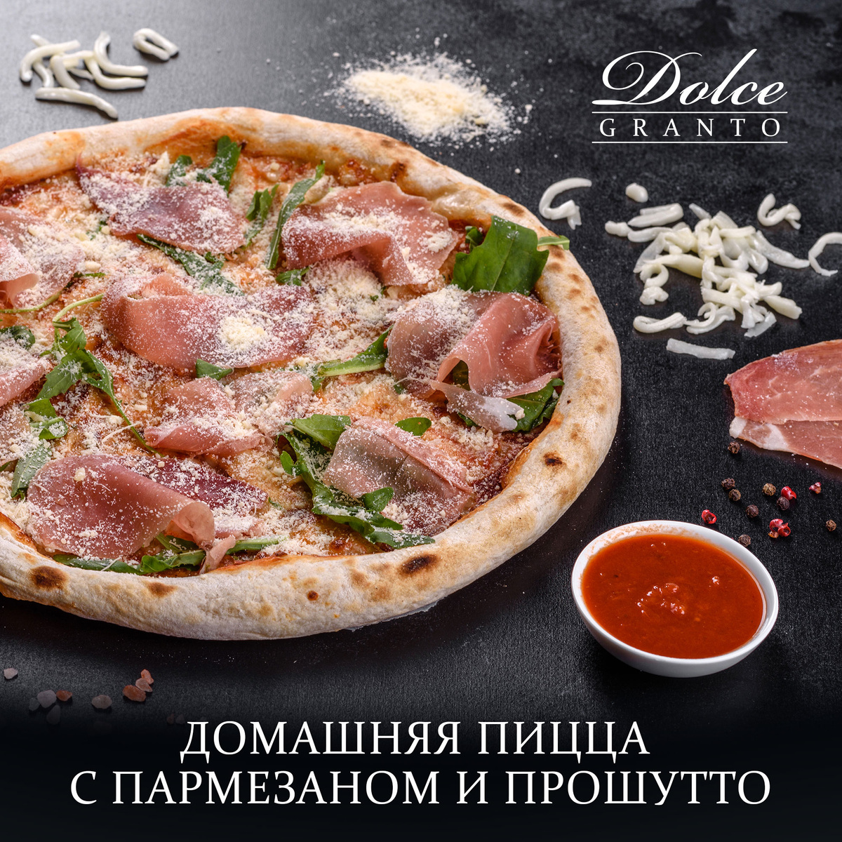 Настоящая домашняя пицца — это не просто тесто, соус и начинка. Секрет идеального вкуса — правильная сырная корочка, которая и тянется, и хрустит одновременно. И тут на сцену выходит Dolce Granto. Его кристаллы и ореховые нотки превращают обычную пиццу с прошутто в маленький гастрономический праздник. Ингредиенты (на 2 средние пиццы) Приготовление Шаг 1: Подготовка теста Раскатайте тесто в тонкий круг. Чтобы корочка была хрустящей, можно немного приподнять края. Шаг 2: Соус и сыр Нанесите томатный соус тонким слоем. Сверху равномерно распределите тертую моцареллу. Затем щедро посыпьте тертым пармезаном Dolce Granto Platinum — именно он создает хрустящую золотистую корочку и насыщает вкус ореховыми нотками. Шаг 3: Прошутто и специи Выложите ломтики прошутто и слегка посыпьте свежемолотым перцем. Для аромата добавьте несколько листиков базилика прямо перед запеканием. Шаг 4: Запекание Разогрейте духовку до 220°C. Запекайте 10–12 минут, пока корочка не станет золотистой, а сыр — тянущим