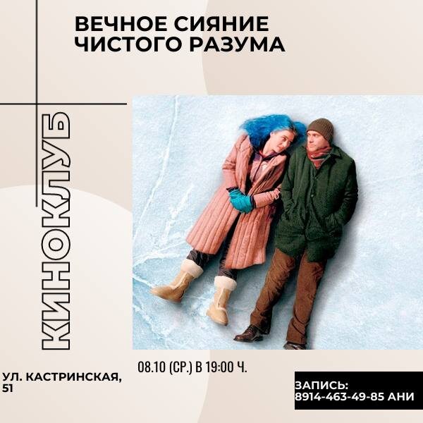 Кинопоказ и обсуждение фильма «Вечное сияние чистого разума» Организаторы предлагают посмотреть культовую драму Мишеля Гондри о памяти, любви и выборе забывать или помнить. А после обсудить – можно ли стереть боль, не потеряв радость? Что сильнее — воспоминания или настоящее? Как кино отражает собственные истории? 🕐08 октября, 19:00 📍Кастринская, 51 ( 2 этаж, вход в дверь с надписью «Ресурс») 🔑300 рублей 🔑запись обязательна или по телефону: 89144634985 #Новости Предложить публикацию:@zabkulisye_bot