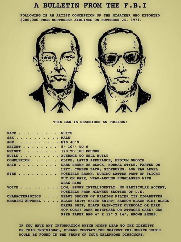 К большому сожалению, не все преступники попадают в руки закона. Да, конечно, идя «на дело», большая часть из них надеется, что их никогда не поймают. Но это удаётся отнюдь не всем. Сегодня я начинаю серию рассказов о самых загадочных бандитах, сумевших либо вовсе избежать наказания, либо скрыться и бесследно исчезнуть. И первым в очереди у нас — некий Д.Б. Купер, который пропал после угона самолёта авиакомпании Northwest Orient Airlines в ноябре 1971 года. Настоящего имени преступника так никто и не узнал. Системы безопасности тогда кардинально отличались от современных, поэтому даже фотографий его не существует. Есть лишь словесный портрет и образ, составленный художником-криминалистом. Итак, Купер, представившийся «Дэном Купером», потребовал от правительства США 200 000 долларов и два парашюта — и, как бы странно это ни звучало, получил и то, и другое. Когда самолёт пролетал над северо-западным побережьем Тихого океана, Купер пристегнул парашют, прихватил с собой деньги, спустился