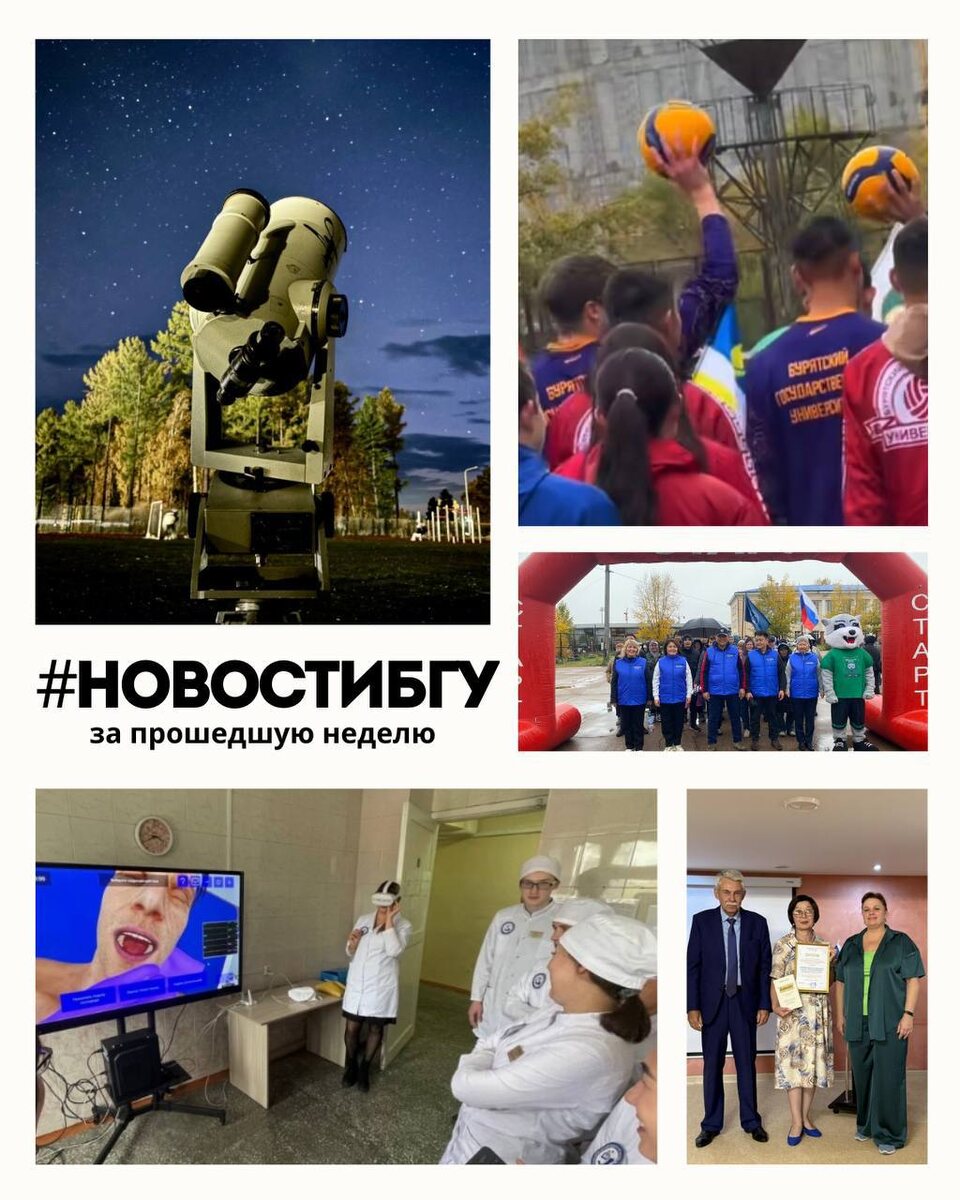 Новости БГУ за прошедшую неделю: 1. В БГУ определили самых спортивных. 30 сентября на стадионе БГУ прошёл традиционный "День здоровья". Кто победил, читайте здесь: bsu.ru 2. БГУ участвует в конкурсе видеороликов "Турнир вузов". Нужны ваши голоса! Голосование продлится до 24 октября на сайте дальнийвосток2030.рф/турнирвузов 3. БГУ – драйвер муниципального развития: научных работы студентов и образовательные программы признаны на федеральном уровне в рамках ХХV Российского муниципального форума в Анапе. Подробнее в материале. 4.Студенты-физики из БГУ увидели поезд Илона Маска в Тункинской долине. Будущие учёные провели экспедицию в Тункинский район, где провели мастер-классы для школьников, наблюдали звёзды через телескоп и рассказали о проекте «Тункинская научная долина» - подробнее здесь. 5. «Виртуальная клиника» для школьников + региональный медицинский образовательный кластер. Подростки примерили роль врачей: учились делать сердечно-лёгочную реанимацию, работать со стетоскопом и