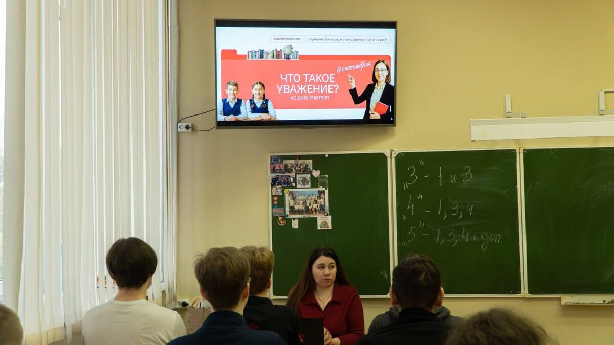 После линейки во всех группах прошли занятия из цикла «Разговоры о важном». Тема этого понедельника — «Что такое уважение?», и она приурочена к Дню учителя.