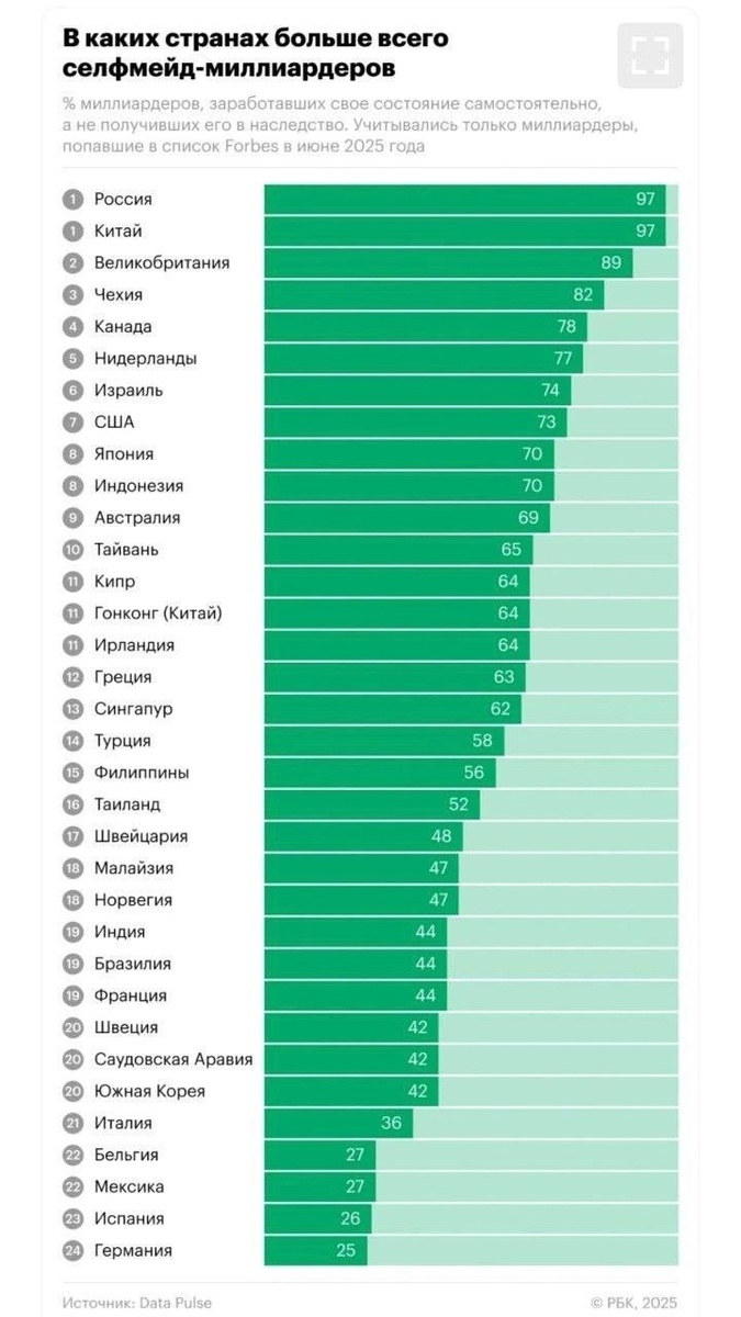 Среди государств мира именно Россия занимает лидирующую позицию по количеству миллиардеров, самостоятельно добившихся своего богатства, а не