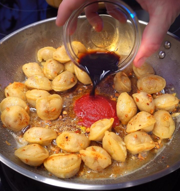 Когда пельмени подрумянятся, добавьте измельчённый чеснок и перемешайте. Затем введите томатную пасту, острый перец и соевый соус. Обжаривайте 1–2 минуты, чтобы аромат чеснока раскрылся.