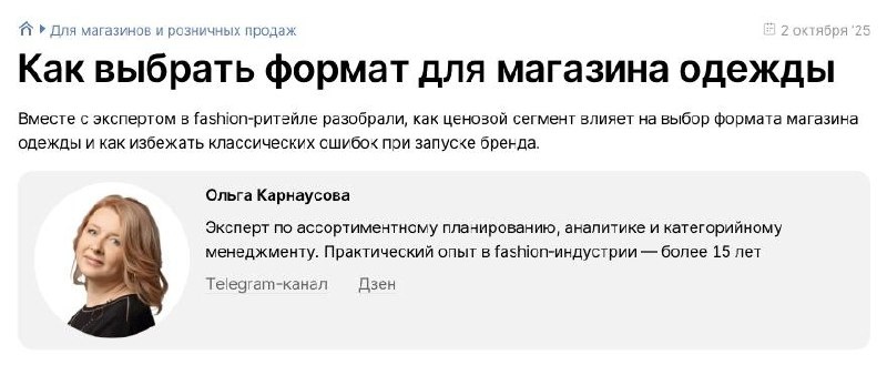 Магазин одежды: с чего начать? 🛍️ Друзья! Для платформы Saby.ru вышла большая статья, в которой я разбираю по косточкам один из главных вопросов для любого ритейлера: «Как выбрать формат для магазина одежды». Кажется, что главное — это красивая коллекция? Но это не единственное условие. Часто провал заложен еще на этапе, когда вы не решили, как именно будете продавать. В этой статье мы обсудили множество вопросов: 🔍 С чего начать? Рассказала, почему детальное изучение своей аудитории — это 80% успеха, и как ценовой сегмент диктует вам правила игры. ❌ Главные ошибки. Разобрала классические ловушки, в которые попадают новички при запуске бренда. Избежать их — уже сэкономить время и деньги. 🛒 Какой формат самый легкий для старта? ⚖️ Мультибренд vs монобренд. Честно о плюсах и минусах каждого направления. Что даст вам больше свободы, а что — быстрее построит лояльность? ✨ Атмосфера как способ продаж. Поговорили о нишевых и очень модных форматах: шоу-румы и винтажные магазины. Ка