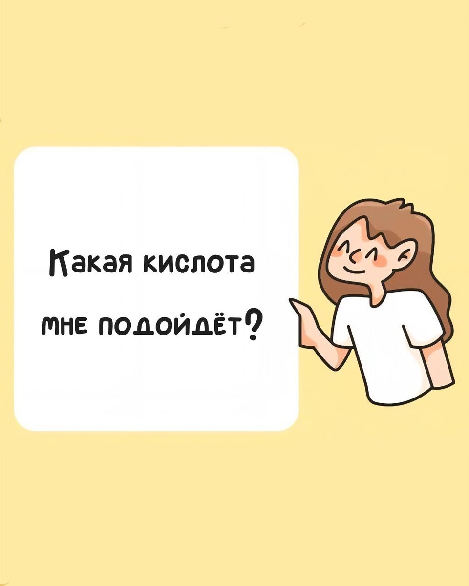 Какая кислота подходит именно вашей коже? Разбираю по типам кожи и эффекту, а то я смотрю многие путаются 1. Для чувствительной кожи Если кожа реагирует на всё жжением, покраснением, шелушением, выбирайте максимально мягкие кислоты: • PHA-кислоты (глюконолактон, лактобионовая) обновляют кожу без раздражения, параллельно увлажняя и укрепляя барьер. Отлично подходят даже при куперозе • Молочная кислота работает как нежный увлажнитель: мягко отшелушивает и делает кожу гладкой и свежей 2. Для сухой и обезвоженной кожи Эти кислоты не просто отшелушивают, а возвращают коже влагу: • Молочная кислота помогает удерживать воду, улучшает мягкость и эластичность кожи • Полиглутаминовая кислота в 4 раза мощнее гиалуроновой, создаёт на коже плёнку, удерживающую влагу, и делает её гладкой и напитанной 3. Для жирной и комбинированной кожи Главная цель очистить поры и сбалансировать жирок на лице: • Салициловая кислота (BHA) проникает в поры, растворяет кожное сало и борется с воспалениями • Миндал