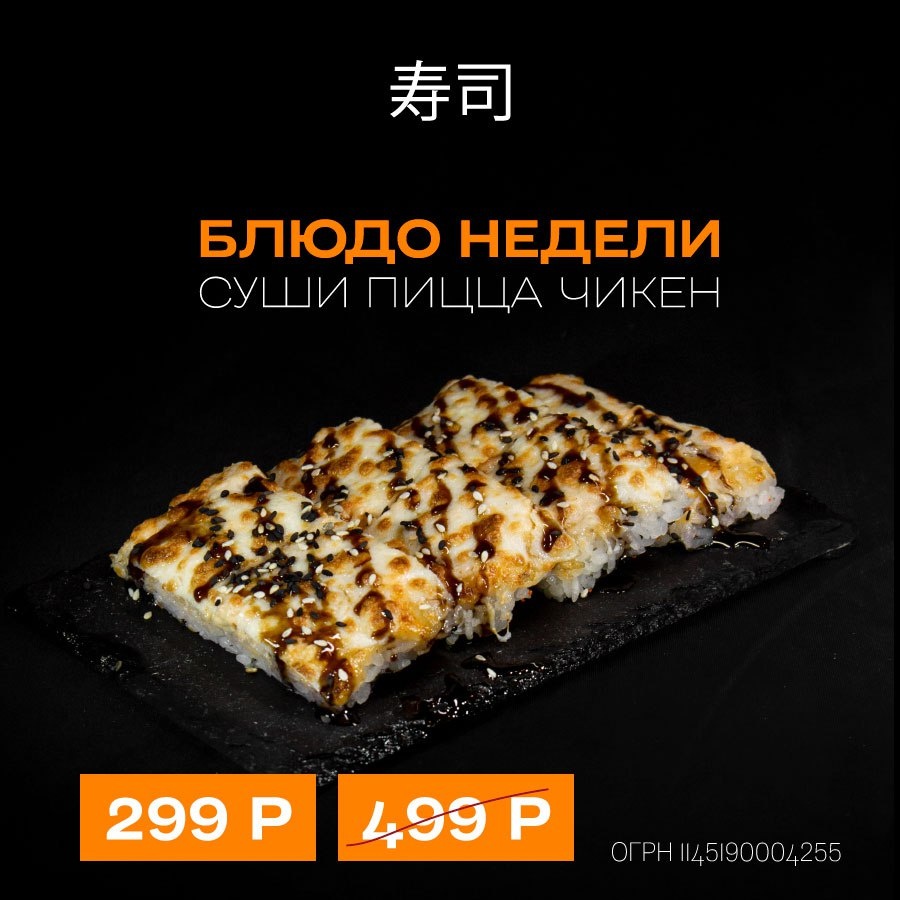 🍕🍣 Блюдо недели — Суши-пицца «Чикен»! 🔥 Только с 06.10 по 12.10 — по суперцене 299 ₽ вместо 499 ₽! 💫 В составе: Рис, нори, нежная курица сувид, соус спайси, зелёный лук, соус нежный, сыр моцарелла, унаги и микс кунжута. 8 кусочков / 230 г удовольствия 😋 🥢 Горячо, сочно и очень вкусно — попробуй хитовое блюдо этой недели! ⚠️ Не более 1 позиции на чек и гостя. ❌ Не суммируется со скидками, бонусами и другими акциями. • Адрес: Мурманск, Кольский пр., 152А • Телефон: +7 (8152) 202-202 • Сайт: sushishop51.ru