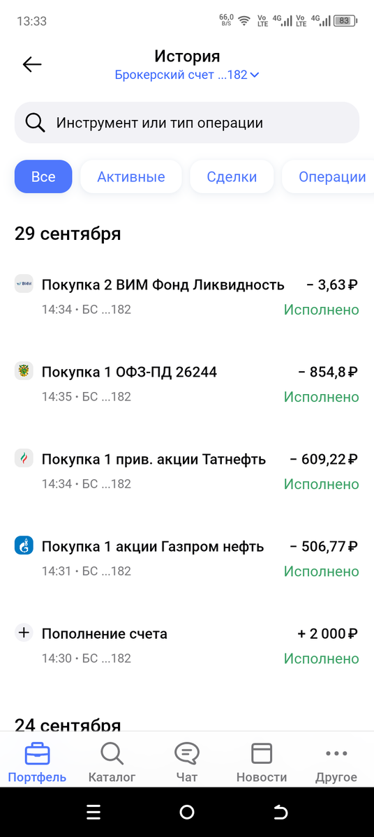 Доброго времени суток! Сентябрь месяц вместе с уборкой урожая остался позади, а значит время подвести итоги прошедшего месяца. Вклад Вклад открытый на 3 месяца на сумму 132205₽ под 16,77% годовых принесли 2004,48₽. Накопительный счёт Сумма накопительного счета в данный момент находится в размере 11971,21₽ из которых 132,82₽ это выплаченная доходность за сентябрь месяц. По традиции пополняю накопительный счёт на 500₽. Брокерский счёт За прошедший месяц произошло : 1.Получен купон по ОФЗ-26244 в размере 56,1₽ 2.Покупка акции Газпром нефть 3. Покупка акции Татнефть 4. Покупка ОФЗ-ПД 26244 5.Покупка 2 ВИМ Фонд Ликвидность. Общий итог Общий капитал теперь составляет 179670,03₽ Общая доходность составила 2194,4₽ Прирост капитала за месяц 2513,53₽ Со снижением ключевой ставки доходность снижается. Но и есть положительная сторона в скором времени одна статья расходов будет ликвидирована, но об этом вы узнаете позже. Соответственно смогу инвестировать больше средств для создания капи