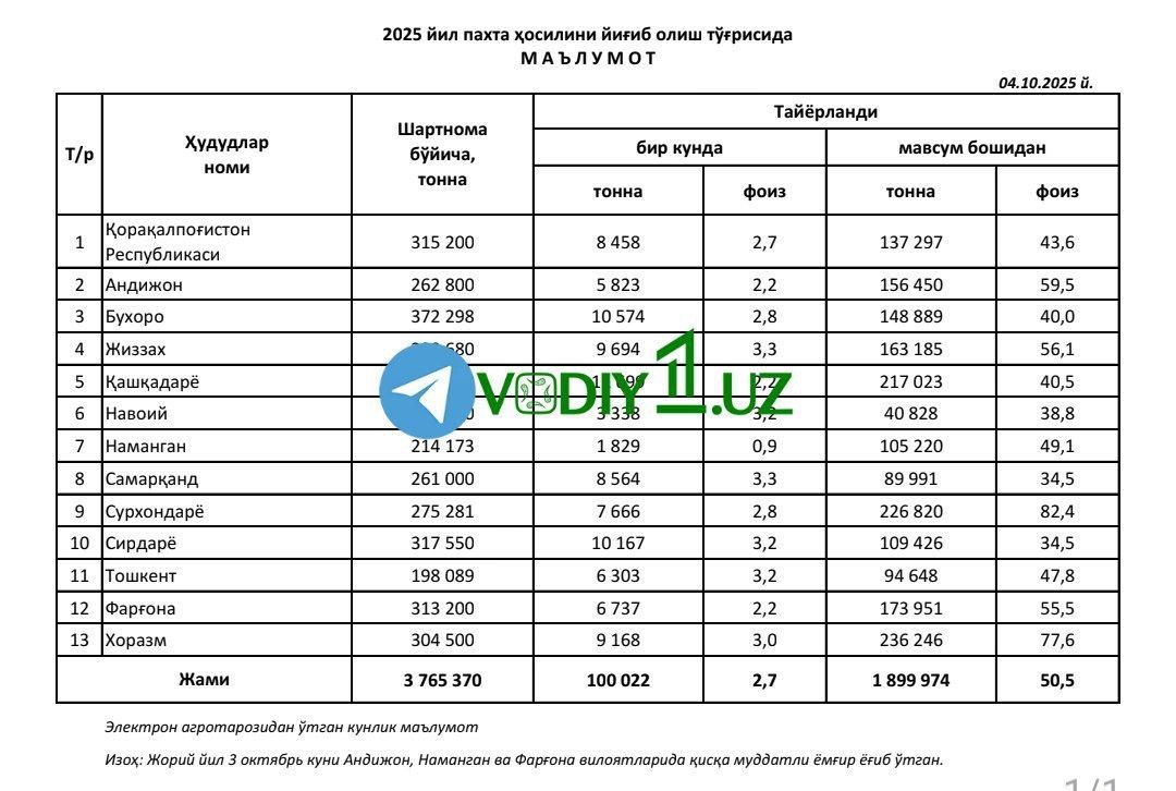 #пахта_мавсуми Жиззах вилоятида 4 октябрь ҳолатига шартномавий режа—топшириқ бўйича 50 % дан зиёд хирмон яратилди. Батафсил тафсилотлар тез кунда сайтимиз саҳифаларида Каналимизга обуна бўлинг ва энг сўнгги янгиликларни кузатиб боринг Jizzaxnews |Тelegram | Facebook | Dzen | YouTubе