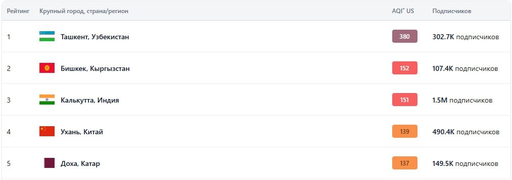 Toshkent havosining iflosligi bo‘yicha dunyoda 1-o‘ringa chiqdi