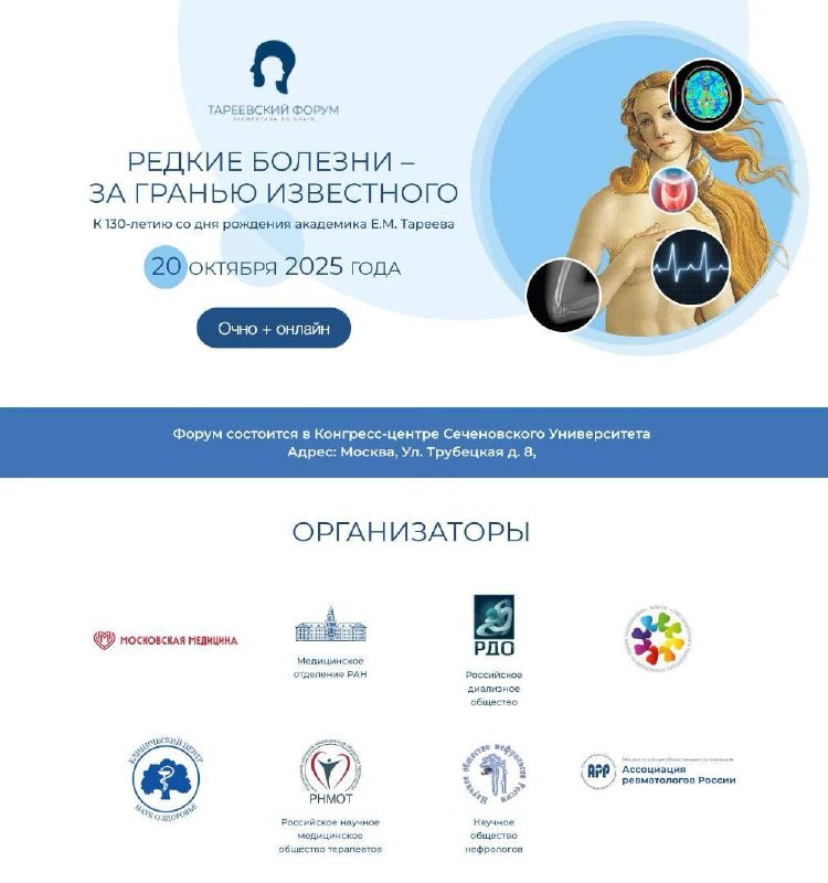 Дорогие коллеги! Приглашаем вас встретиться в Москве! 📆 В понедельник 20 октября 2025 г. в 09:00 МСК в Конгресс-центре Сеченовского Университета начнёт свою работу конференция «Тареевский форум: редкие болезни – за гранью известного», приуроченная к 130-летию со дня рождения академика Е.М. Тареева. 🏁 Место проведения: Москва, ул. Трубецкая д.8 (смотреть на Яндекс.Картах) 🧬 Мероприятие направлено на повышение уровня знаний медицинского сообщества о редких заболеваниях. 👩🏼⚕️👨🏻⚕️🧑🏽⚕️ Форум объединит ведущих специалистов в сферах ревматологии, нефрологии, гепатологии, пульмонологии, чтобы совместно обсудить уникальные клинические случаи, современные методы диагностики и инновационные подходы к лечению редких болезней. 🏥 Это уникальная возможность для специалистов расширить свои профессиональные горизонты, сделать помощь пациентам с редкими заболеваниями более эффективной, наладить ценные контакты и внести вклад в развитие направления, которое требует особого внимания и ус