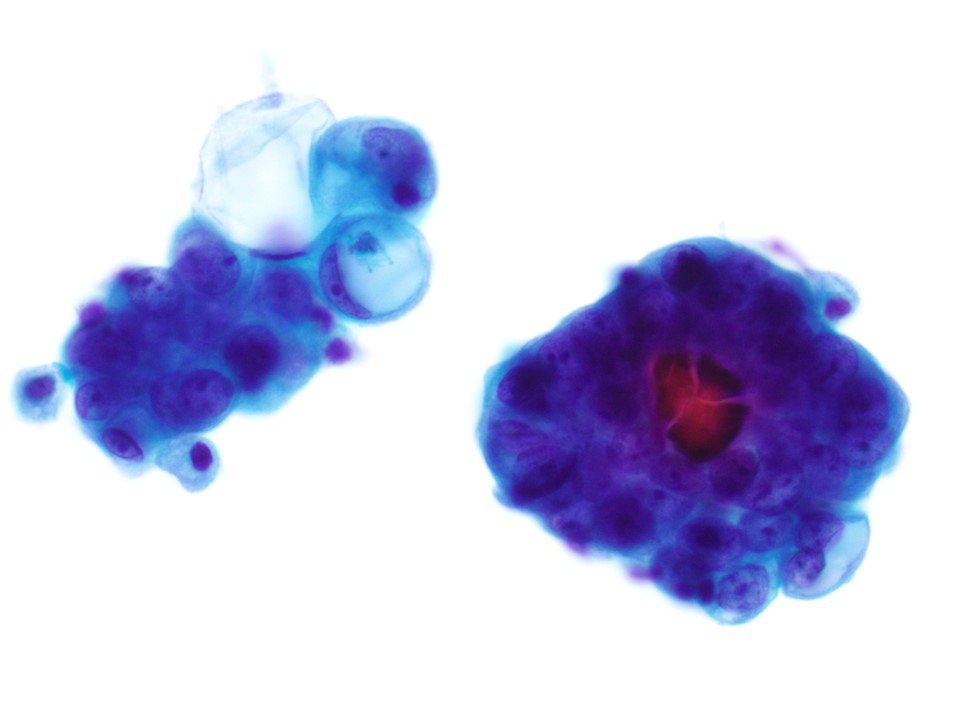 Плевральный выпот с метастазирующей серозной карциномой, демонстрирующей классическое вакуолизированное строение цитоплазмы по типу «мыльного пузыря» и псаммомные кальцификаты