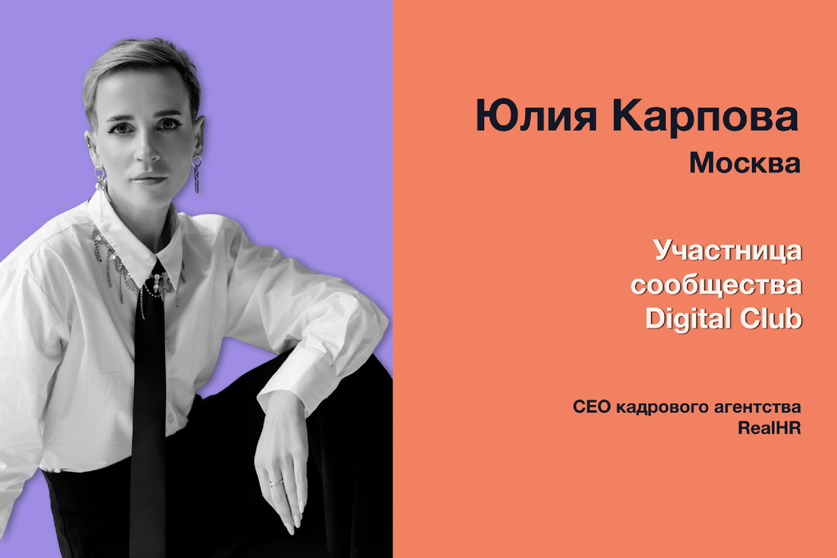 Сегодня наша гостья – Юлия Карпова. Юля – участница сообщества Digital Club и CEO кадрового агентства RealHR.
