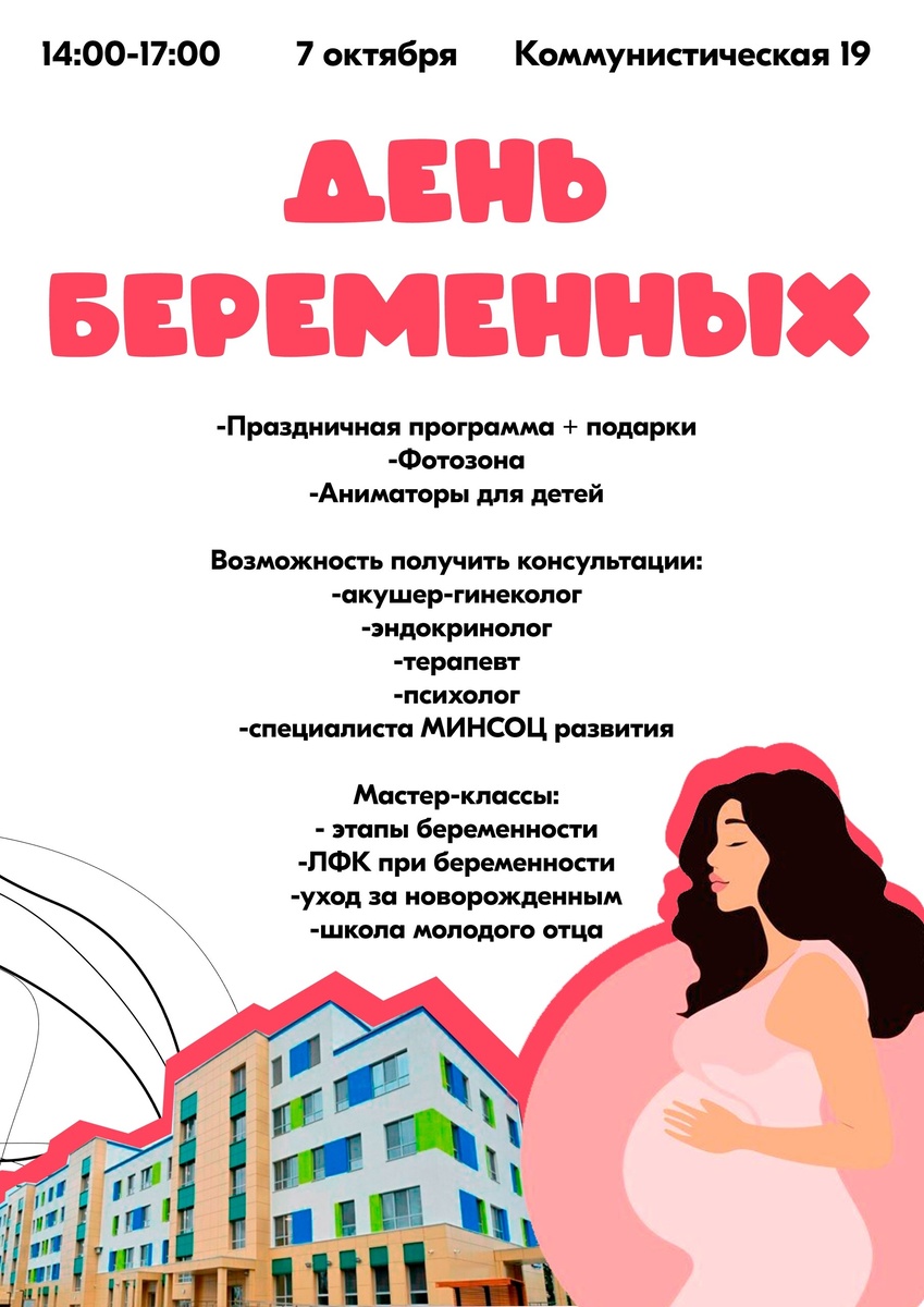 Приглашаем всех будущих мам и их семьи на «День беременных»! Мероприятие состоится 7 октября с 14:00 до 17:00 по адресу: улица Коммунистическая, 19. В программе праздника — праздничная атмосфера с подарками, фотозона для памятных снимков и аниматоры для детей. Вы сможете получить консультации от специалистов: акушера-гинеколога, эндокринолога, терапевта, психолога, а также специалиста МИНСОЦ развития. Также пройдут мастер-классы по важным темам: этапы беременности, лечебная физкультура для беременных, уход за новорожденным и школа молодого отца. Ждем вас на теплом и полезном празднике! #здоровье@glavachus