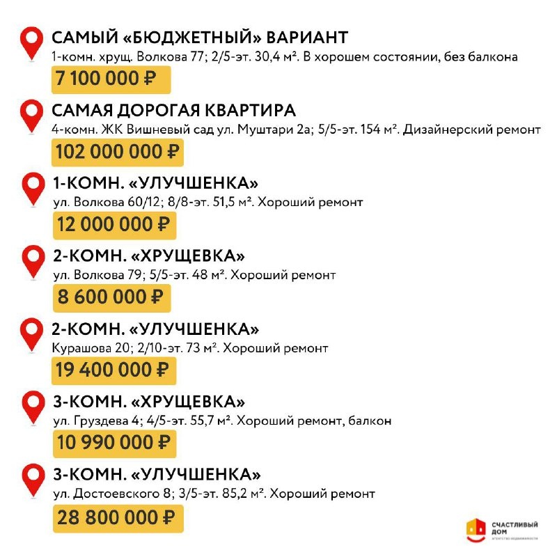 Жить около 131 лицея Вчера был замечательный праздник - День учителя и давайте посмотрим сколько стоит жильё около 131 лицея; Почему около него? Основанный в 1961 году до сих пор не сдает своих позиций по количеству максимальных ЕГЭ, выигранных олимпиад и одаренных детей; Самый «бюджетный» вариант, 1-комн. хрущевка найдена на Волкова 77 за 7 100 000 ₽, а самая дорогая квартира 154 кВ.м в ЖК Вишневый сад за 102 000 000 ₽ 1-комнатную 50 кв.м с отделкой и техникой можно приобрести за 12 000 000 ₽, двушку на Курашова 20 за 19 400 000₽