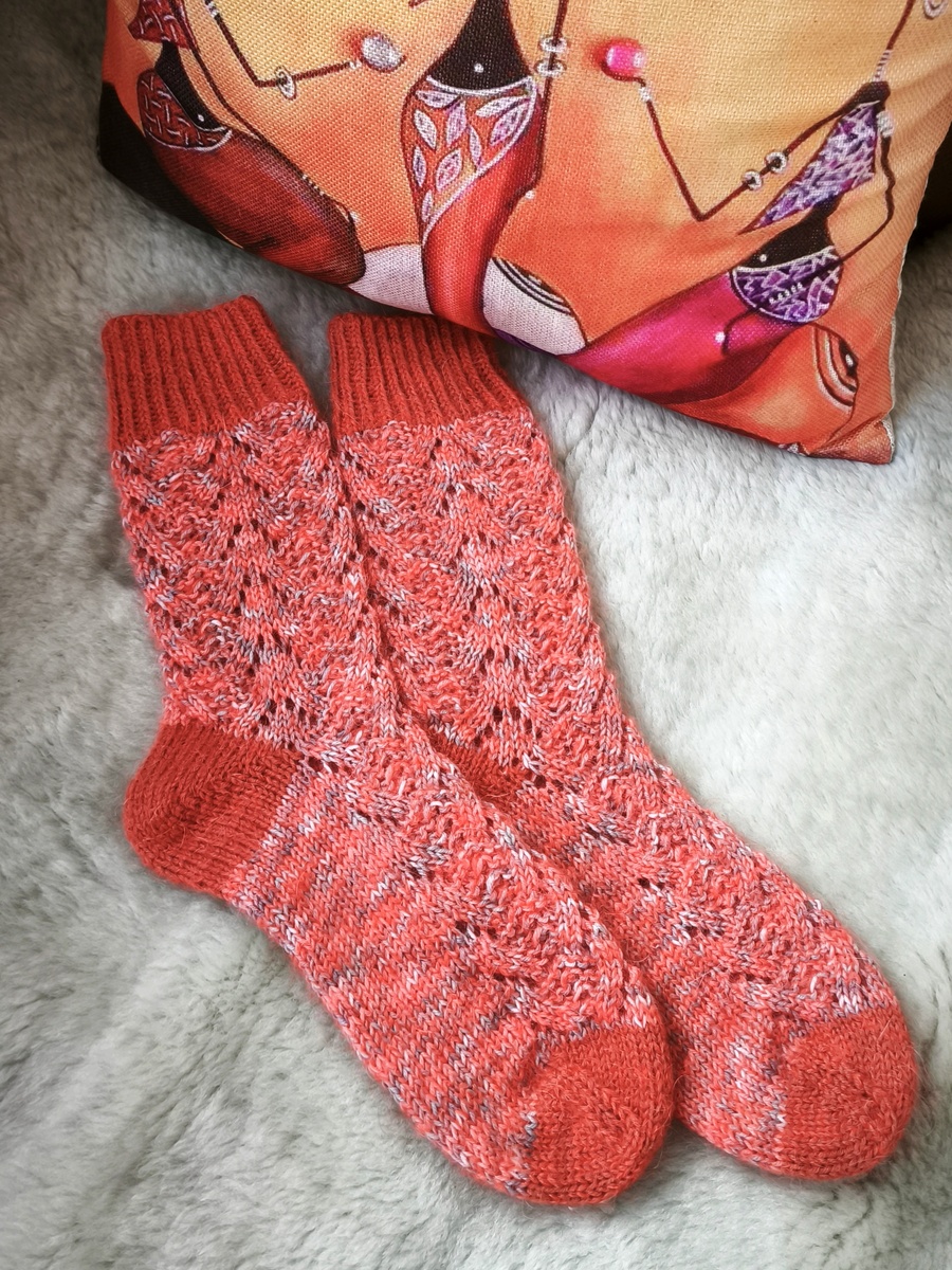 Сообщаю, что составила описание на вот такие замечательные носочки и под впечатлением своей недавней поездки в Швейцарию, назвала их Альпы Это уже вторая пара, связанная из носочной пряжи, подаренной мне при встрече на Балтике моей вязальной подружкой Татьяной. Как же из одного мотка пряжи у меня получились 2 полноценные пары носков? И даже остался миниатюрный клубочек. Элементарно! Я взяла в компаньоны мохер и контрастную пряжу, вязала на 48 петлях спицами 2,5. Первую пару связала в своём путешествии в гости к дочке. Оставила их Карине, для подарка её подружке Оле, к которой она в скором времени поедет в северную Норвегию. Думаю, они ей там очень пригодятся. Вторую пару, чтобы не проводить в пустую время в самолете, я связала по дороге домой. Обе пары я вязала на деревянных или даже бамбуковых носочных спицах, которые специально купила в дорогу за 3 копейки. Если честно, очень удивилась, когда они выжили в процессе работы, поскольку гнулись в руках, как силиконовые. Ощущения был