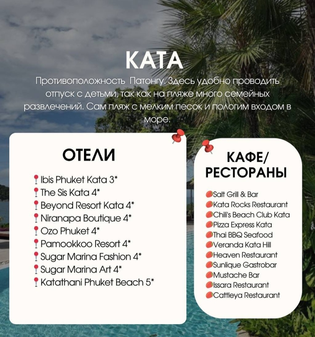 🌿 Най-Харн (Nai Harn) Один из самых живописных пляжей Пхукета — чистейшая бирюзовая вода, зелёные холмы вокруг и спокойная атмосфера. Здесь нет шумных баров, зато есть уютные кафе, вкусные смузи-бары и прогулочная зона вокруг озера. Пляж популярен у семей и тех, кто хочет спокойствия. 🏨 Из отелей особенно рекомендую: The Nai Harn Phuket 5* — шикарный вид на море, прямой спуск к пляжу, один из лучших завтраков на острове. Sunsuri Phuket 5* — чуть выше на холме, отличные номера с видом и трансфер на пляж. By The Lake Villas — вариант для семьи или компании, виллы с бассейнами в пешей доступности от моря. 🏄♂️ Ката (Kata Beach) Ката — это золотая середина между спокойствием и активностью. Море здесь чистое, волны бывают, но не сильные, так что отлично подходит для начинающих серферов и семей с детьми. На Кате много кафе, ресторанов, массажных салонов, маркетов и аренды байков. 🏨 Популярные отели: Chanalai Flora Resort 4* — в 5 минутах от моря, с уютной территорией. The Boathou