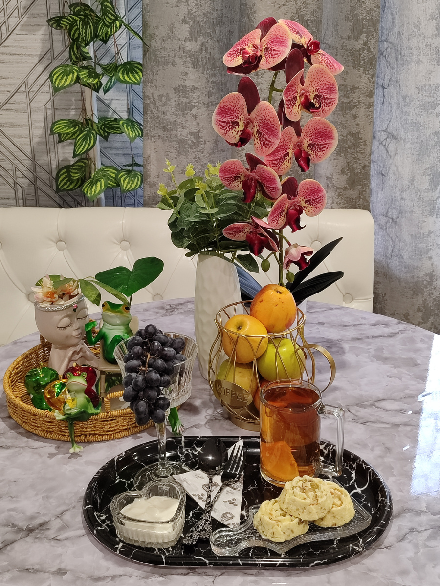 Вареники с хрустящим жареным луком и оливками, со сметаной, несколько виноградин и чай с сахзамом и лимоном.