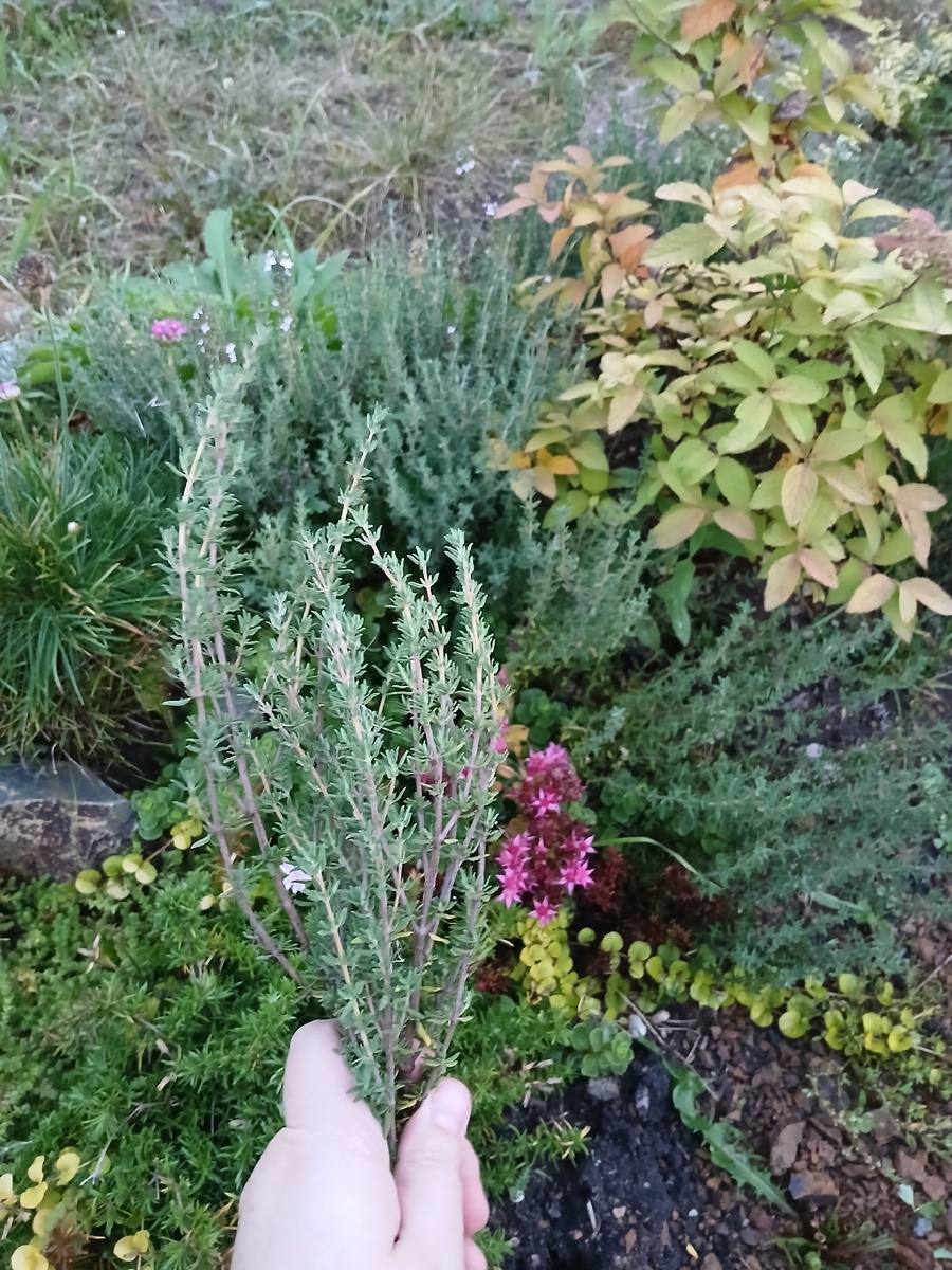 Чабрец можно прекрасно вырастить и дома, на чай с лихвой хватит. Я так делала, лежит сушёный, пьётся потихоньку. Но в то же время он достаточно неприхотливый и выносливый, а также хорошо разрастается. Можно выращивать как почвопокровник. А учитывая ситуацию с сорняками на целине, почвопокровникам мы говорим решительное и однозначное ДА! Сеяла семенами сразу в грунт. Сеяла много, взошёл не весь, но тот, который взошёл, сидит стойко и растёт во все стороны бодрыми кустиками. Не знаю, сколько сортов (и какие), потому что высыпала несколько пакетиков вперемешку. Но, как минимум, два разных сорта на фото видно. Первый какой-то очень обычный, растет вертикальными побегами, второй похож на лимонный и ползёт по земле, но не так агрессивно, как мята. Цветут оба ароматно и привлекают пчёлок и шмелей. Кроме чая, кстати, можно использовать в других блюдах - ростбиф, например, запечь, или соус какой-нибудь интересный забабахать. Хоть всё лето ходи да щипай веточки, отрастает быстро. В общем, рекоме