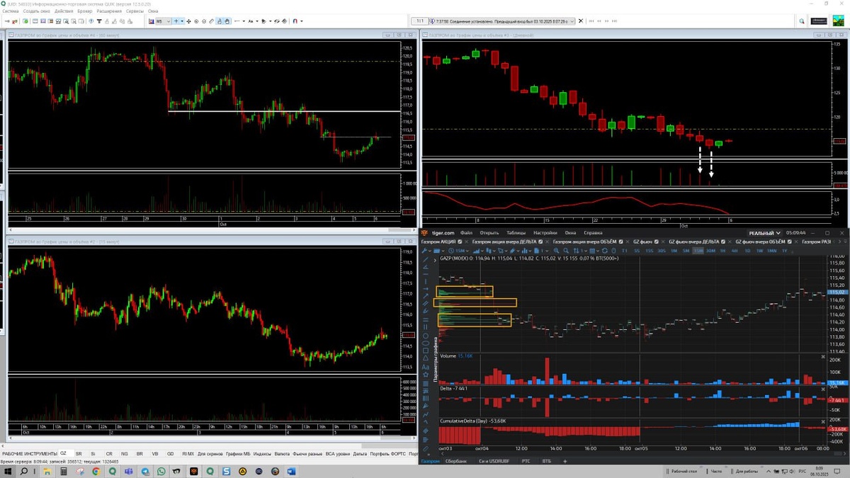 Газпром. В пятницу средний прогресс вниз на среднем объёме – вполне себе уверенное продолжение тренда. В выходные сначала шло продолжение движения вниз, а в воскресенье попытались отбиться. В итоге за два дня цена сходила вниз и вернулась к закрытию пятницы. Интересно, что в воскресенье преобладали активные покупки и крупные лимитные ордера на продажу, но в зоне хая движения вышел большой сайз на покупку, который поддержал рост и поспособствовал добою. Видимо, кому-то это было надо.) Однако объём за выходные маленький и все что происходило имело значение очень локальное, чисто для торговли внутри дня. На сегодня важно, что цена снова на уровне закрытия пятницы, на самом лоу поддержки, от которой отбивались в июле и ближайшая поддержка ниже в районе 106 руб. Активности покупателей мы не видим, внешнего позитивчика для рынка нету, а от речи Владимира Владимировича для рынка веет скорее негативом, так что жду продолжения снижения.