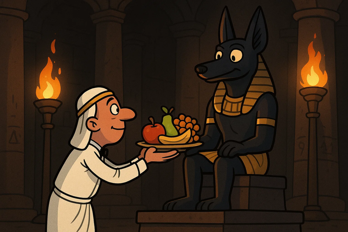 Египтяне верили, что миром правят могущественные боги. Чтобы боги не злились и не насылали засуху или болезни, их нужно было задабривать. Для этого: Обслуживанием богов занимались профессионалы — жрецы. Они были как бы "личными помощниками" и "переводчиками" богов. Только жрецы знали тайные молитвы и могли заходить в храм, чтобы "покормить" статую, одеть её и умаслить благовониями. Поскольку все верили, что жрецы говорят от имени богов, они были очень богатыми и влиятельными людьми. У египтян было множество богов, часто с головами животных. Вот главные "суперзвезды": Самый главный египетский миф очень напоминает мультфильм "Король Лев"! Осирис воскрес, но не остался на земле, а стал царём и судьёй в загробном мире. А Гор стал покровителем всех живых фараонов. Этот миф объяснял смену времен года: когда природа умирала от засухи — это "умирал" Осирис, а когда Нил разливался и всё зеленело — он "воскресал". Египтяне верили, что после смерти каждого ждёт главный экзамен — суд Осириса. Чтоб