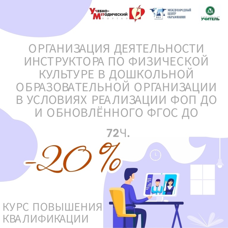 Курс повышения квалификации "Организация деятельности инструктора по физической культуре в дошкольной образовательной организации в условиях реализации ФОП ДО и обновлённого ФГОС ДО (72 ч.)" со скидкой 20%. https://www.uchmet.ru/events/item/3890665/ Формат: дистанционно, круглосуточный доступ к записям занятий и материалам (офлайн) Форма обучения: заочная Содержание настоящей программы повышения квалификации предусматривает рассмотрение следующих методических аспектов: - Нормативно-правовое сопровождение деятельности дошкольной образовательной организации в условиях реализации обновлённого ФГОС ДО. - Федеральная образовательная программа дошкольного образования – структурные элементы. - Физическое развитие и формирование правил здорового образа жизни у детей дошкольного возраста в условиях реализации ФГОС ДО. - Организация физкультурно-оздоровительной деятельности в разных возрастных группах в соответствии с ФОП ДО. - Современные технологии физического воспитания и развития детей до