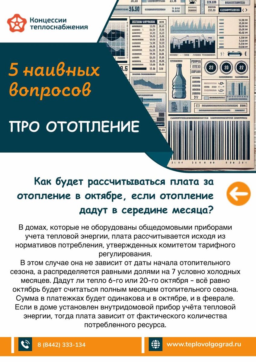 В Волгограде пока не начался отопительный сезон. По информации «Концессий теплоснабжения», одним из «наивных» вопросов про отопление стал «как будет рассчитываться плата в октябре, если тепло дадут в середине месяца»? По информации специалистов, в домах, которые не оборудованы общедомовыми приборами учета тепловой энергии, плата рассчитывается исходя из нормативов потребления, утвержденных комитетом тарифного регулирования. В этом случае все зависит от даты начала отопительного сезона, а плата распределяется равными долями на 7 условно холодных месяцев. — Дадут ли тепло 6 или 20 октября, все равно октябрь будет считаться полным месяцем отопительного сезона. Сумма в платежках будет одинакова и в октябре, и в феврале. Если в доме установлен внутридомовой прибор учета тепловой энергии, тогда плата зависит от фактического количества потребленного ресурса, — уточнили в «Концессиях». Ранее на вопрос, почему нельзя включать отопление хотя бы по ночам, концессионеры ответили, что включение и о