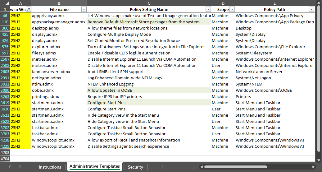 ⚙️ Групповые политики Windows 11 25H2 🔹 ADMX Windows 11 25H2 - административные шаблоны. 🔹 XLSX Windows 11 25H2: скачать | просмотреть в браузере - все параметры реестра групповых политик. Незаменимая штука для домашних изданий. Если, конечно, политика в них срабатывает. На картинке все новинки. 🔹 Веб: https://gpsearch.azurewebsites.net/ - поиск, удобно ссылаться на конкретную политику. Прокомментирую три наиболее интересные политики. 🔸 Remove Default Microsoft Store packages from the system Автоматическое удаление магазинных приложений, идущих в поставке с образом (список из политики). В документации указано, что работает только в изданиях Enterprise и Education. Прочие продолжают возиться с удалением из образа или после установки. 🔸 Allow Updates in OOBE Я рассказывал в канале, что чистая установка Windows занимает много времени из-за установки обновлений на этапе OOBE. Этой политикой можно заблокировать обновления. Но применять её надо на ранних этапах установки. Поэтому