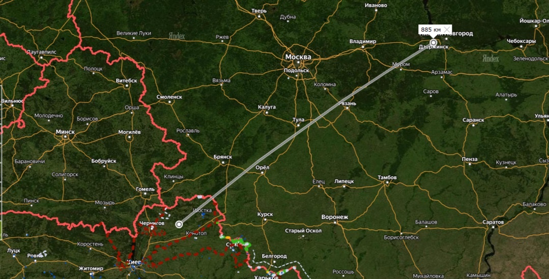 Ниже расстояние по прямой от возможной точки запуска беспилотников (это последняя точка, которую наши накрыли на прошлой неделе) до города. Почти 900 километров, не рекорд, но расстояние очень приличное. Такое расстояние их беспилотники преодолели в выходные, когда они прилетели по НПЗ в Ленинградской области: