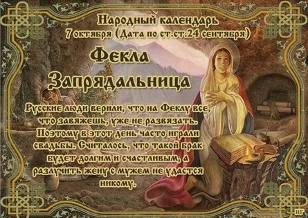 Во вторник 7 октября отмечается память святой Феоклы, последовательницы апостола Павла, которая мужественно перенесла много испытаний из-за своей святости и девственной чистоты. В возрасте 18 лет она осознанно приняла христианскую веру, став невестой Небесного Жениха. ❇️ПРИМЕТЫ ✔️Птицы низко к земле летят – зима будет ранняя и холодная. ✔️Много желудей – зима будет мягкой, а следующий год – урожайным. ✔️Гром в этот день сулит теплую и бесснежную зиму. ✔️Если белка от хвоста к голове линяет, зима будет студеная. Если наоборот, то долгая и слякотная. ✔️Если большой урожай рябины, то зимой будет холодно. ❌ЧТО НЕЛЬЗЯ ДЕЛАТЬ ✔️Запрещено закрывать жильё снаружи – в доме обязательно кто-то должен быть. В него в этот день пытаются войти благополучие и достаток, а для этого дверь должна быть заперта только изнутри. ✔️Ходить в гости и принимать их у себя в эту среду не стоит, иначе можно разругаться с друзьями и близкими в пух и прах. ✔️Не рекомендуется этот день для переговоров, подписан