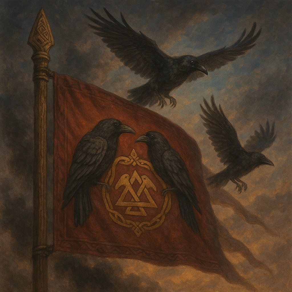 На древних скандинавских знамёнах, чёрных, как ночь над фьордами, реяли два ворона. Их крылья будто сотканы из самой тени, а глаза — из холодного сияния северного солнца.