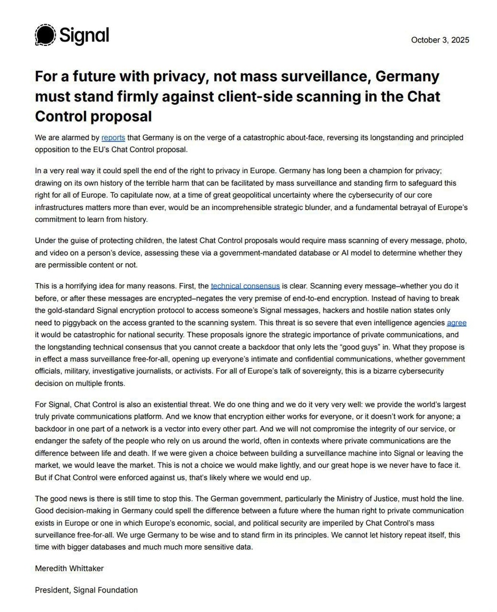 πΠΠ΅ΡΡΠ΅Π½Π΄ΠΆΠ΅Ρ Β«Π‘ΠΈΠ³Π½Π°Π»Β» ΡΠ°ΡΠΊΡΠΈΡΠΈΠΊΠΎΠ²Π°Π» ΠΏΠ»Π°Π½Ρ ΠΠ‘ Π²Π²Π΅ΡΡΠΈ ΡΠΎΡΠ°Π»ΡΠ½ΡΡ ΡΠ»Π΅ΠΆΠΊΡ Π·Π° ΡΠ°ΡΠ°ΠΌΠΈ. ΠΡΠ΅Π·ΠΈΠ΄Π΅Π½Ρ Signal Foundation ΠΠ΅ΡΠ΅Π΄ΠΈΡ Π£ΠΈΡΡΠ°ΠΊΠ΅Ρ ΠΏΡΠΈΠ·Π²Π°Π»Π° ΠΠ΅ΡΠΌΠ°Π½ΠΈΡ Π½Π΅ ΠΏΠΎΠ΄Π΄Π΅ΡΠΆΠΈΠ²Π°ΡΡ ΠΈΠ½ΠΈΡΠΈΠ°ΡΠΈΠ²Ρ ΠΠ²ΡΠΎΡΠΎΡΠ·Π° ΠΏΠΎΠ΄ Π½Π°Π·Π²Π°Π½ΠΈΠ΅ΠΌ Chat Control. ΠΠ½Π° ΠΏΡΠ΅Π΄ΡΡΠΌΠ°ΡΡΠΈΠ²Π°Π΅Ρ Β«ΠΊΠ»ΠΈΠ΅Π½ΡΡΠΊΠΎΠ΅ ΡΠΊΠ°Π½ΠΈΡΠΎΠ²Π°Π½ΠΈΠ΅Β» ΠΊΠΎΠ½ΡΠ΅Π½ΡΠ° Π½Π° ΡΡΡΡΠΎΠΉΡΡΠ²Π°Ρ
