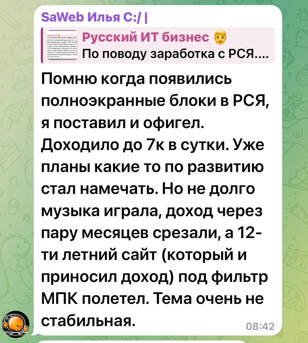 Еще мнение по поводу заработка с РСЯ. К сожалению у нас тоже не получается зарабатывать так. Вывод? Ну время заработка на статейниках, кажется, уходит или надо искать другие рекламные источники. P.s роботов надо делать, роботов :) Русский ИТ бизнес