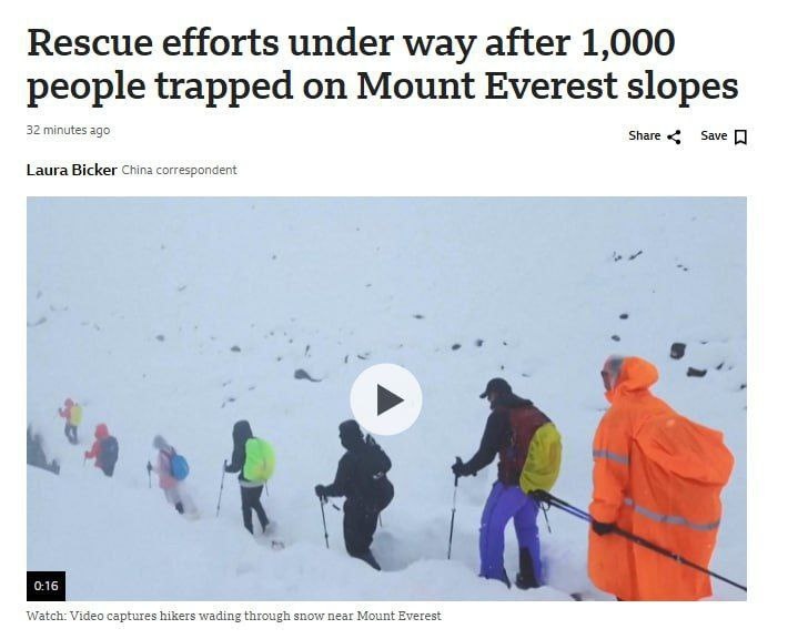 🏔 Почти 1000 человек оказались в ловушке на склонах Эвереста после внезапной метели Как сообщается, пока спасены около половины из них, спасательные работы продолжаются несмотря на сильный снег и риск переохлаждения. Дороги заблокированы, а вход в туристическую зону Эвереста приостановлен.
