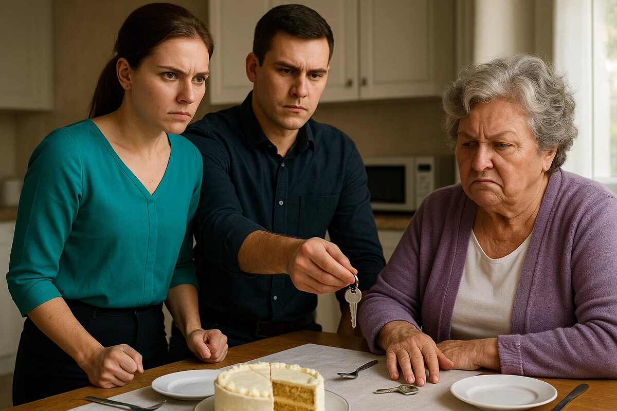 Марина режет торт. Нож входит в бисквит, а рука дрожит. Игорь сидит рядом, достаёт из кармана связку ключей и кладёт на стол — прямо на край тарелки Галины Петровны.