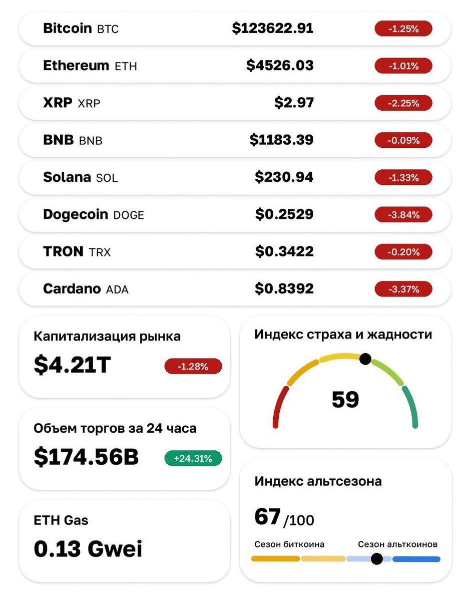 ☕️ Крипторынок на утро 06.10.2025 Индекс страха и жадности: 59 Индекс альтсезона: 67 Доминация BTC: 59,12% 😭 Ликвидации: За последние 24 часа было ликвидировано 98 978 трейдеров, общая сумма ликвидаций составила $253.49 million. Самый крупный отдельный ордер на ликвидацию произошел на Hyperliquid - BTC-USD на сумму $4.00M. Лонг $177.10M Шорт $76.40M Лонг/Шорт держатели BTC: 🙈 Лонг: 45,40% Шорт: 54.60% Дневник Криптоинвестора🚦
