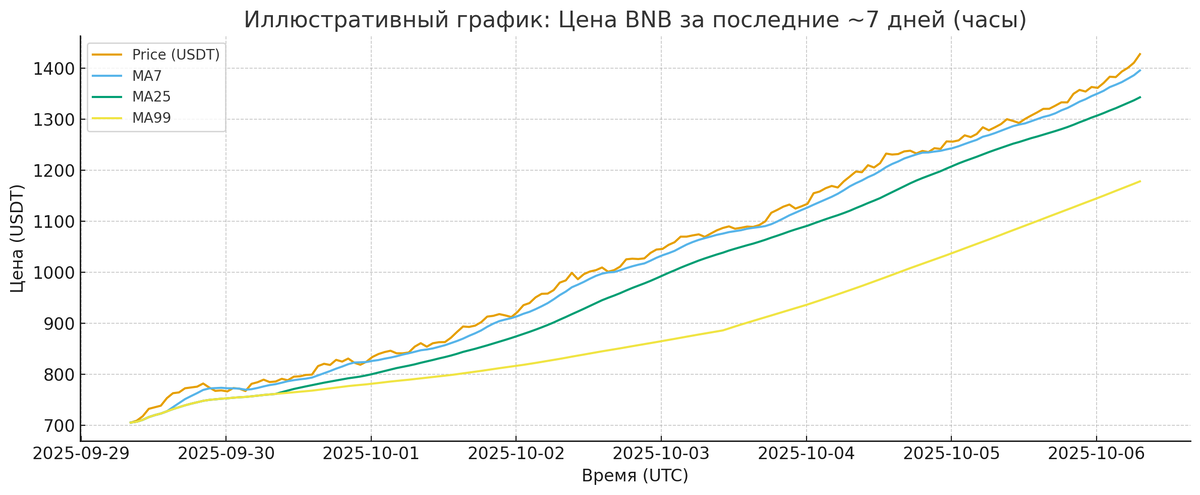 - Тренд: явный коротко- и среднесрочный аптренд — цена выше MA7, MA25 и MA99 на часовом/дневном таймфреймах (на графиках видно быстрые скользящие средние, подтягивающиеся вверх). (Иллюстративный график: «Цена + MA»).