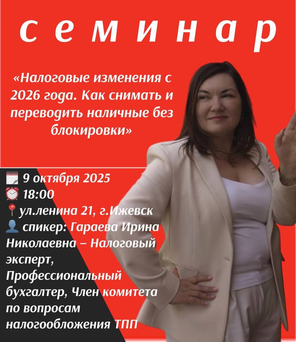 ЮМИ КОНСАЛТ проводит мероприятие в Альфа банке 🅰️🅱️ 9 октября (четверг) в 18:00, 1 этаж отделения, 🏦 ДО Ижевск Центральный тема: «Налоговые изменения закона 2026 года. Как снимать и переводить наличные без блокировки»💰 Спикер: Гараева Ирина Николаевна - налоговый эксперт, профессиональный бухгалтер, Член совета по налогам ТПП, стаж в профессии 23 года 🤌 Произошли налоговые изменения в законодательстве.🤯 ⚖️ Законопроект уже выложен, и мы будем разбирать его постатейно: — повышение НДС, — новые правила для УСН, — изменения по страховым взносам, — рост МРОТ и зарплат, Под пристальным вниманием находятся предприниматели которые все еще принимают оплату на свои личные карты и Не хотят платить комиссию банку за эквайринг, тем самым сильно рискуют🫣 Для регистрации писать - @YumiNalog