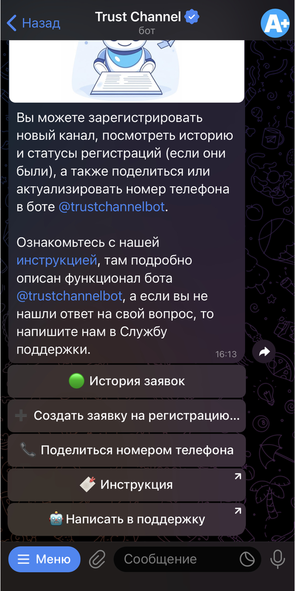 С 1 ноября 2024 у крупных блогеров и иных пользователей социальных сетей появилась дополнительная отчетность. Теперь они обязаны направлять в Роскомнадзор идентифицирующие сведения о себе. Новые правила регистрации для блогеров с 10 000+ подписчиками я рассказывала в статье. С тех пор произошли некоторые изменения в процедуре. Рассмотрим как зарегистрировать ваш Telegram-канал в соответствии с законом №303-ФЗ от 8 августа 2024 года и получить для него отметку “А+”. Заявление на регистрацию канала подается через госуслуги. После получения номера заявления на госуслугах необходимо в Telegram запустить бот @trustchannelbot. Он предложит принять Пользовательское соглашение. Далее боту необходимо передать данные: Далее необходимо добавить бот @trustchannelbot в администраторы регистрируемого канала и выдать следующие права:
