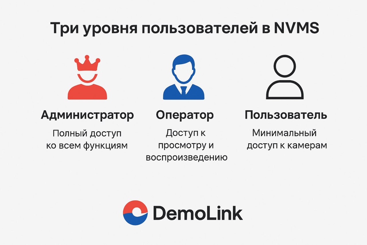 Безопасность системы видеонаблюдения начинается не с камер, а с того, кто и как имеет к ней доступ. В NVMS предусмотрено три уровня пользователей: 👑 Администратор Полный доступ ко всем функциям. Может добавлять и удалять пользователей. Настраивает систему, хранилища и права доступа. 🛠 Оператор Доступ к просмотру камер, воспроизведению архива, работе с тревогами. Не может менять основные системные настройки. 👤 Пользователь Минимальный доступ: просмотр отдельных камер или только Live View. Настройки и архив для него недоступны. 🔑 Советы по безопасности: Сразу после установки замените пароль admin — это основа защиты. Разделяйте роли: администратор не должен использоваться для ежедневного входа. Создавайте отдельные учётные записи для сотрудников, чтобы отслеживать действия. Настраивайте расписания доступа (например, ограничение входа вне рабочего времени). 💡 Благодаря гибкой системе прав вы сможете защитить свою систему от несанкционированного доступа и контролироват