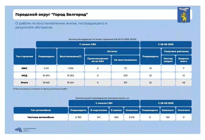За неделю в Белгороде восстановили 48 жилых объектов Количество повреждённых домов увеличилось на 32. Всего осталось отремонтировать 301 помещение, сообщил на оперативном совещании правительства мэр города Валентин Демидов. С 29 сентября по 5 октября были повреждены шесть автомобилей (не включая последствия обстрела в минувшее воскресенье). Всего на восстановление ТС подано 130 заявок. Мы на связи в MAX Подписаться на нас|Предложить новость