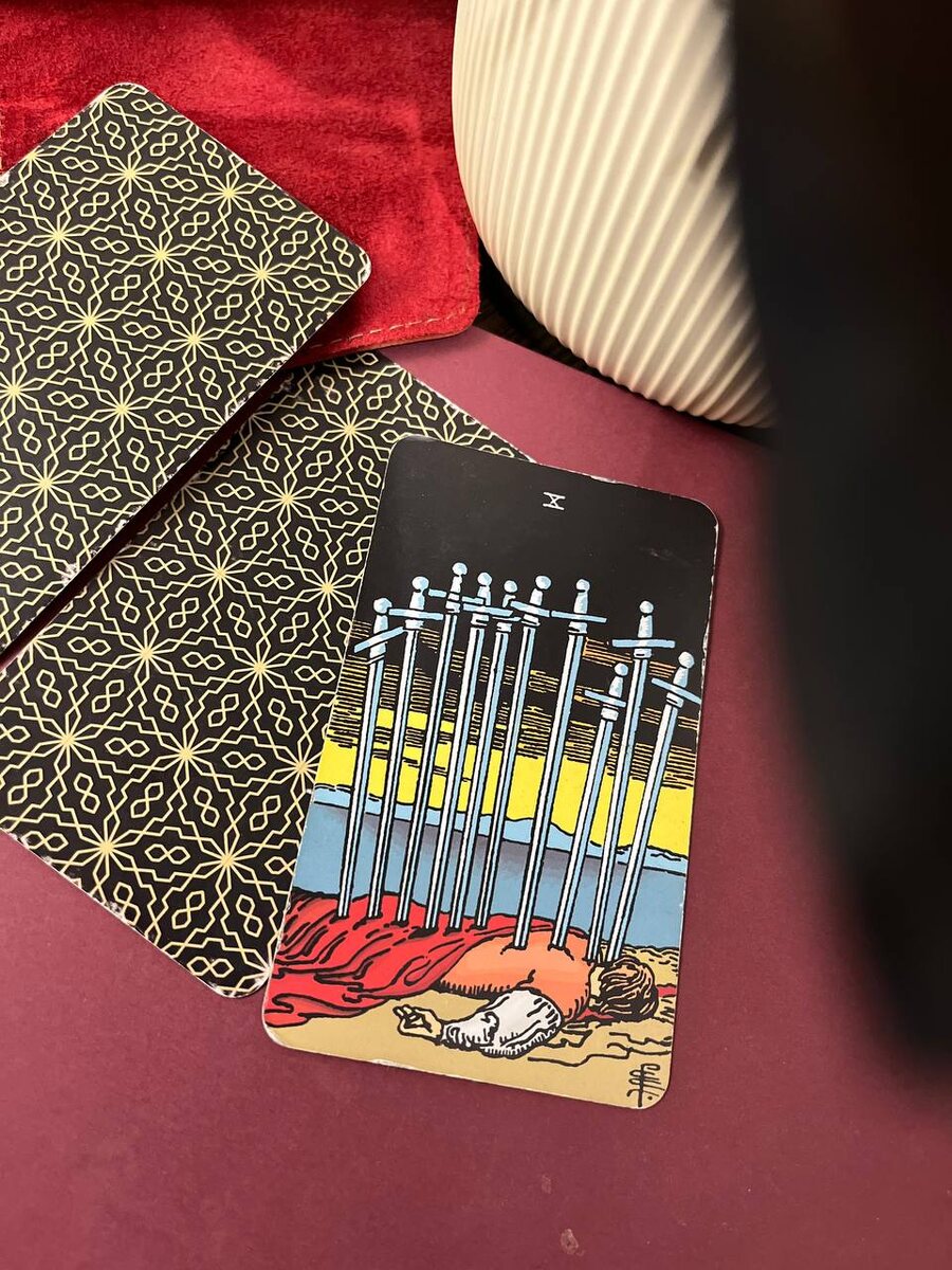 ✏️✏️✏️✏️✏️ 3️⃣ 10 мечей - карта, которая, с одной стороны, максимально пугающая (действительно, зачастую она показывает максимальный накал ситуации и эмоционального состояния), но с другой - посмотрите на желтое небо среди полной темноты - оно говорит о том, что событие или чувство пришло к своему завершению и если Вы справитесь с трудностями - то впереди Вас ждет «белая» полоса с новыми красками и возможностями! Пройдите эти испытания достойно и Вселенная ответит Вам приятным бонусом ❤️