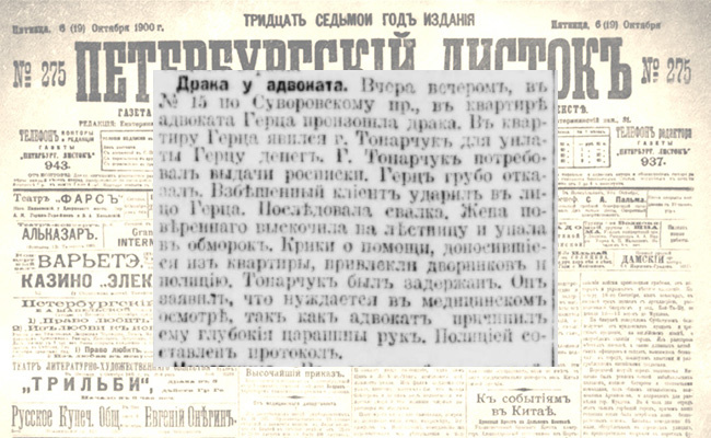Городские новости из прессы дореволюционной России. День в день – 6 октября в 1890, 1900 и 1910 годах. Минимум политики, максимум того, что волновало жителей столицы и других городов России. Включая юмор, житейские зарисовки, и, разумеется, рекламу. Вчера вечером, номере 15 по суворовскому проспекту, в квартире адвоката Герца произошла драка. В квартиру Герца явился господин Тонарчук для уплаты Герцу денег. Господин Тонарчук требовал выдачи расписки. Герц грубо отказал. Взбешенный клиент ударил в лицо Герца. Последовала свалка. Жена поверенного выскочила на лестницу и упала в обморок. Крики о помощи, доносившиеся из квартиры, привлекли дворников и полицию. Тонарчук был задержан. Он заявил, что нуждается в медицинском осмотре, так как адвокат причинил ему глубокие царапины рук. Полиция составлен протокол. (Петербургская Газета. 6 октября 1910 года, среда) Механикам-самоучкой, крестьянином ярославской губернии Петром Войновым, как нам сообщают, изобретён весьма остроумный прибор для выч