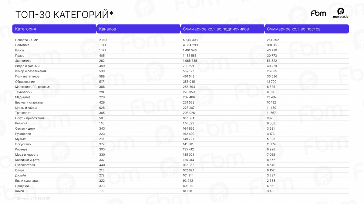 Компания Fly By Metrics запустила платформу MaxStat.IO – первый российский сервис для анализа данных о каналах в мессенджере MAX. Сервис позволяет специалистам получить информацию об аудитории, динамике роста и активности подписчиков. MaxStat.IO разработан для сбора аналитики по медиаполю в MAX. Мы сами столкнулись с нехваткой достоверных данных, когда искали площадки для собственных размещений. Поэтому создали инструмент, который собирает статистику по каналам, формирует каталог и предоставляет сводные данные для анализа аудитории и содержания публикаций, – сообщили в компании Fly by Metrics. В рамках запуска сервис представил первую выборочную статистику, собранную за период с 12 по 26 сентября 2025 года. Согласно данным MaxStat.IO, в мессенджере MAX насчитывается более 6,4 тысяч активных каналов. Наибольшее число площадок приходится на категории «Новости и СМИ» (2967 каналов с общей аудиторией 5,5 млн подписчиков) и «Политика» (1144 каналов) с аудиторией 4,3 млн подписчиков). Сущест