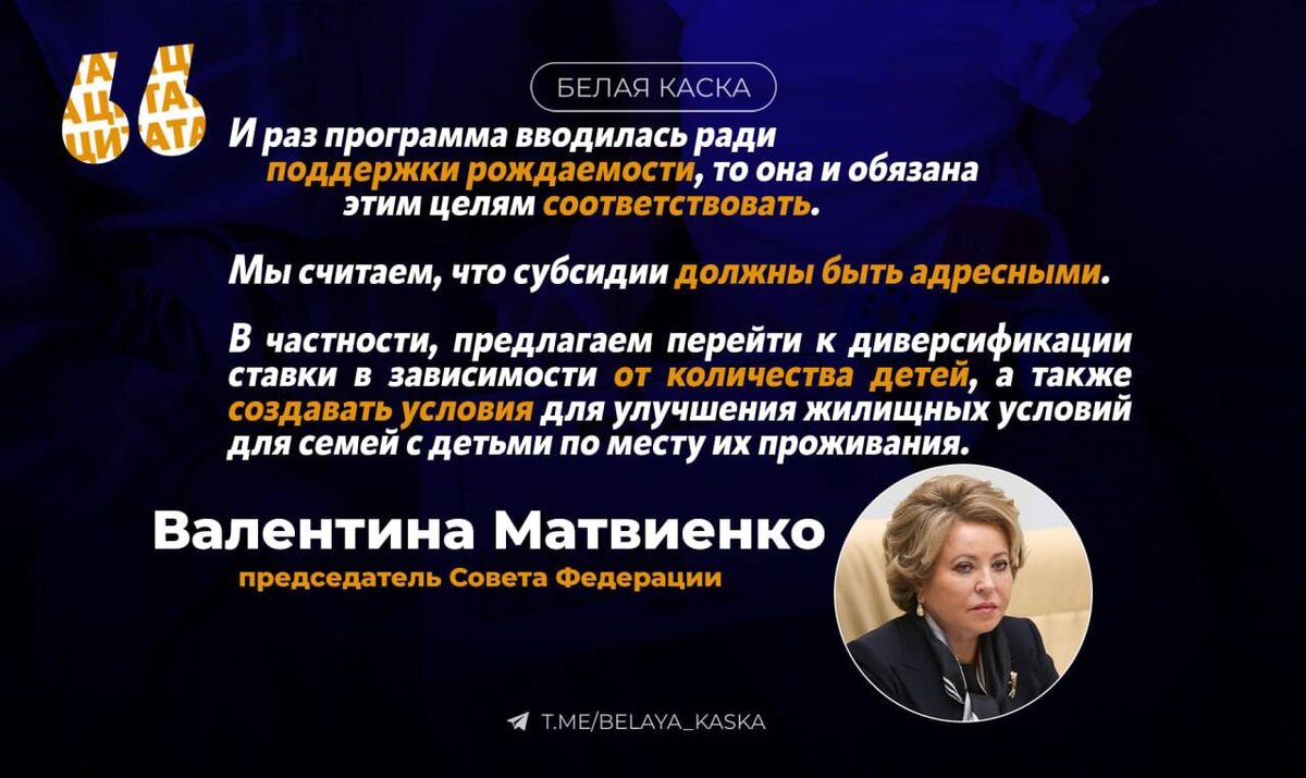 В ответ на пост 🪖 Прорабатываются меры по донастройке субсидирования семейной ипотеки — Совет Федерации ⚡️ Валентина Матвиенко, спикер Совфеда: Совсем скоро состоится заседание президентского Совета по реализации государственной демографической и семейной политики. Вместе с экспертами мы прорабатываем целый ряд предложений, которые позволят донастроить действующие подходы. Например, это касается совершенствования субсидирования льготной семейной ипотеки. — И раз программа вводилась ради поддержки рождаемости, то она и обязана этим целям соответствовать. Мы считаем, что субсидии должны быть адресными. В частности, предлагаем перейти к диверсификации ставки в зависимости от количества детей, а также создавать условия для улучшения жилищных условий для семей с детьми по месту их проживания.