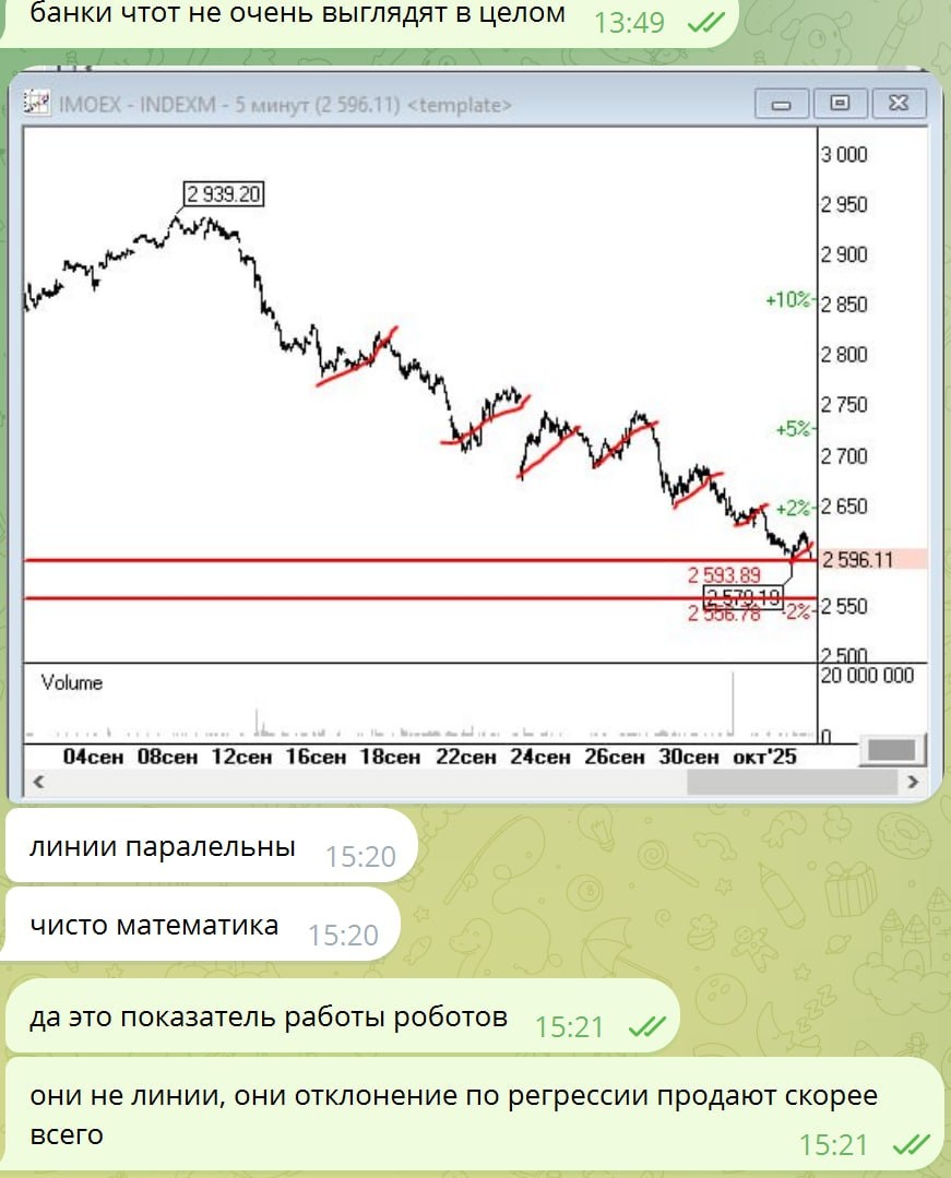 ⬆️ В предыдущем посте напрягающие моменты привёл вам не зря. Рынок снова пытаются продавливать. Скрин одного из диалогов. Многие трейдеры замечают, что рынок ведёт себя вот так монотонно: ☝️Когда то давно впервые такое появилось на американском рынке, когда алгоритмы фондов начали делать большую часть оборота и цена акций и индексы порой часто стала ходить "по струнке". ☝️Почему цена ведёт себя именно так. Роботы крупняка не торгуют по паттернам или классическому тех. анализу. Там в основном используются модели статистические, разные регрессии и т.д. ☝️Условно говоря когда есть какая то цель падения, до неё рассчитывается ход цены и машинки начинают продавать отклонения от этого движения. Когда цену продавливают, они останавливаются, без этой продажи рынок идёт наверх и когда цена достигает какого то стандартного отклонения продажа снова включается. ☝️Так что та самая "струнка" о которой вам писал выше по индексу или отдельным индексным бумагам, чаще всего это какая то линия лине
