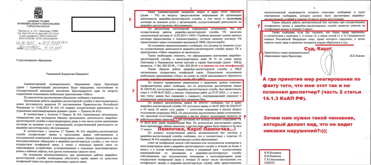 6 октября 2025 года я получил очередную отписку от заместителя главы муниципального образования г. Краснодар И.К. Павлова от 03.10.2025 №35-П-18899.19-К.