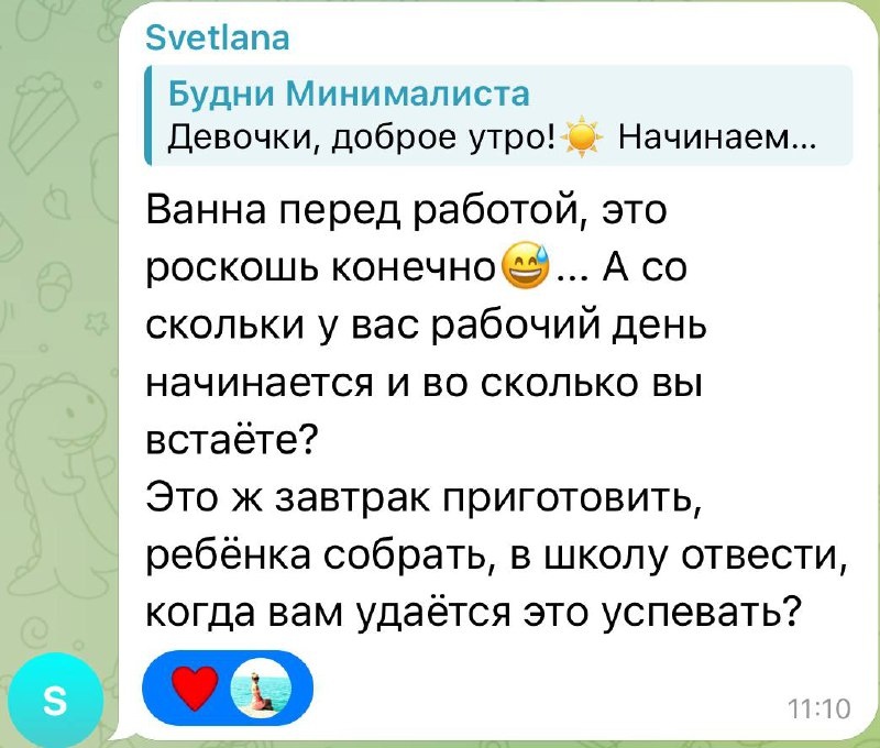 #вопрос-ответ Мой рабочий день начинается с 9:00. Обычно встаю между 6-7 утра, все зависит, во-первых, какие дела утром нужно сделать. Во-вторых, от моего состояния, как я высплюсь, больше это зависит от времени года, летом раньше просыпаюсь. Сегодня будильник был на 7:00, проснулась в 6:55. Сын на больничном, поэтому сейчас он у родителей, когда сборы в школу, то утро гораздо суматошнее, ванну могу себе позволить, если только проснусь около 6:00. На сборы у меня был час, я немного полежала, потом поставила варить гречку на завтрак, пока она варилась, помыла голову и полежала в ванной, все вместе минут 15-20. Потом позавтракала, оделась, накрасилась и поехала на работу. Когда сыну надо в школу, то я просыпаюсь примерно в 6:30, готовлю ему одежду, перекус в школу и нам завтрак. Отвожу к 8:00 в школу и еду на работу. А как проходит Ваше утро?