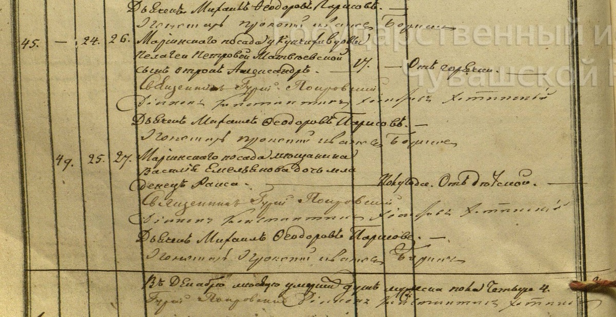 Город Чебоксары и его уезд. Метрические книги о рождении, браке и смерти. 1 января 1859 — 31 декабря 1859. ГИА Чувашской Республики (ГИА ЧР), фонд №225, опись №3, дело №128, стр. 1299 Архив ГИА Чувашской Республики (ГИА ЧР) Фонд Чебоксарское духовное правление Опись дел постоянного хранения Метрическая книга Казанской губернии Чебоксарского уезда Мариинского Посада Богородицкой церкви 1859 год. Третья часть. О умерших. Стр. 1299 скан. № 45. Умер 24 декабря, отпет 26 декабря. Мариинского Посада купчихи вдовы Пелагеи Петровой Матвеевской сын отрок Александр 17 лет. От горячки. Похоронен на посадском кладбище. Погребение совершил: Священник Гурий Покровский. Диакон Константин Хотинский. Дьячок Михаил Парисов. Пономарь Прокопий Борисов.