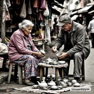 Идет вот так однажды вдоль рядов Иннокентий и, допустим, всего‑то лишь хочет поинтересоваться у той вон торговки с лисьими лицемерными глазами о стоимости вон того чайника, который ему вовсе не нужен, но очень хочется узнать. Ну так просто, спросить, указывая рукой на разложенную на земле скатерть с немногочисленным потасканным туда-сюда товаром: – Скажите, сколько стоит вон та вещица? – Какая та? – недоверчиво и капризно пялит глаза на предстоящего пред ней ботанического очкарика Елизавета Петровна Балаболкина, всю свою сознательную жизнь просидевшая у эскалатора и следившая за порядком на станции метро N, тут недалеко. – Та! – высовывает весь в чернилах указательный палец Кеша и почти тыкает им в чайник… Балаболкина, вроде как не понимая, куда клонит указующий перст, показывает по другую сторону разложенной скатерти, на не нужную никому вещь, лежащую совсем не там, где отмечено фиолетово-синим перстом вопрошающего. – Эта? – Да не эта! А вон та! Чуть ли не упав мордой на разложенные ш