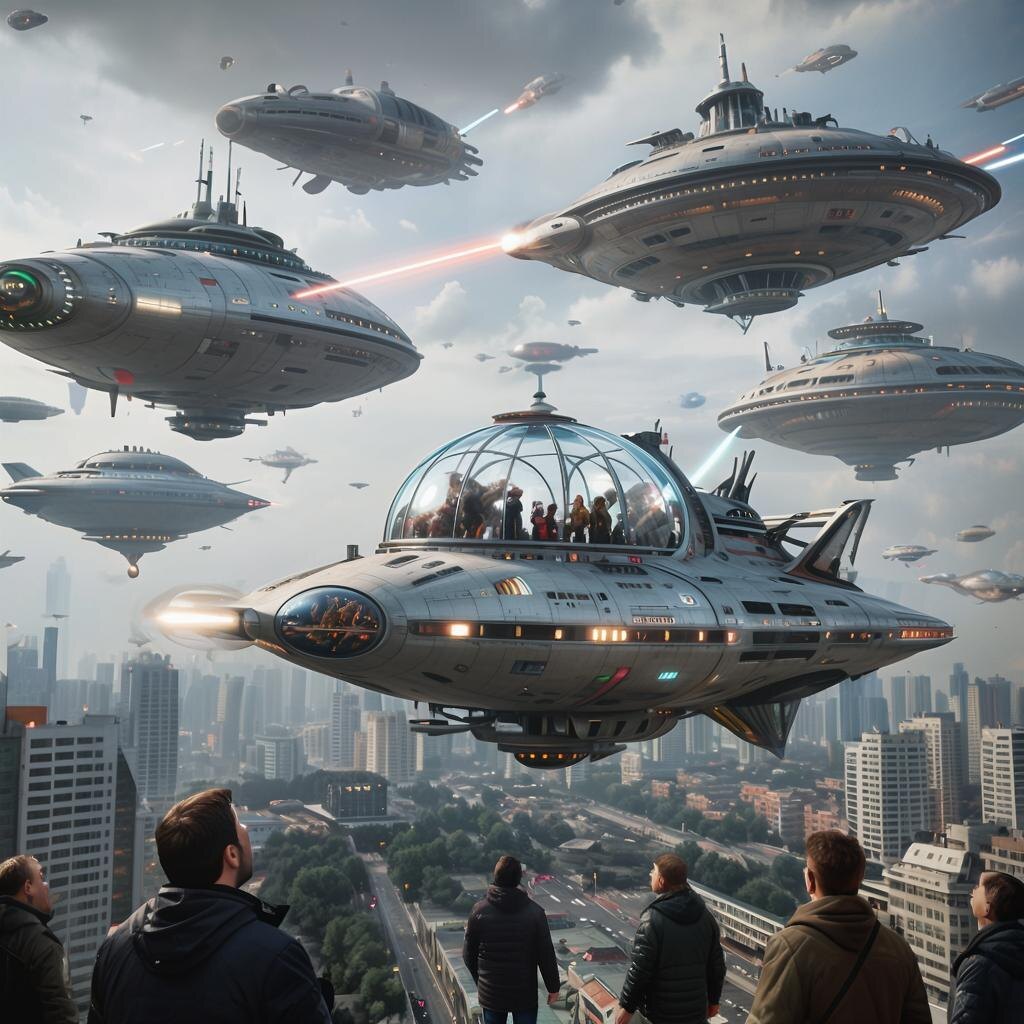 Глава 1 Звездное небо над Москвой внезапно озарилось ярким светом. Тысячи огней, словно звезды, спустились с небес и зависли над городом. Люди замерли в изумлении, глядя на это зрелище. Никто не мог поверить своим глазам. Это были не обычные самолеты или вертолеты. Это были огромные корабли, покрытые странными символами и орнаментами. Они медленно двигались по небу, излучая мягкое голубое свечение. Через несколько минут на улицах появились существа, похожие на людей, но с ярко-зелеными глазами и серебристой кожей. Их одежда была сделана из неизвестного материала, который переливался всеми цветами радуги. Они говорили на непонятном языке, используя устройства, которые превращали их речь в понятные человеческие слова. Люди слушали их внимательно, пытаясь понять, что происходит. Глава 2 Инопланетяне объявили, что пришли на Землю с миром. Они рассказали, что их планета находится на грани уничтожения и они ищут новый дом. Земля стала для них последней надеждой. Люди были потрясены эт